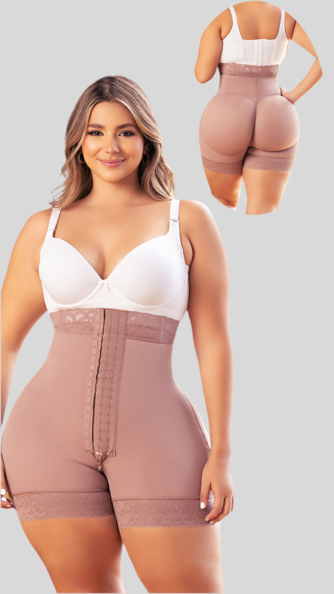 Shapewear shorts made of powernet fabric, high-compression, three lines of snaps in front, tummy control, perineal closure, buttock lift, lace on legs and waist with silicone bands so it doesn't roll up.